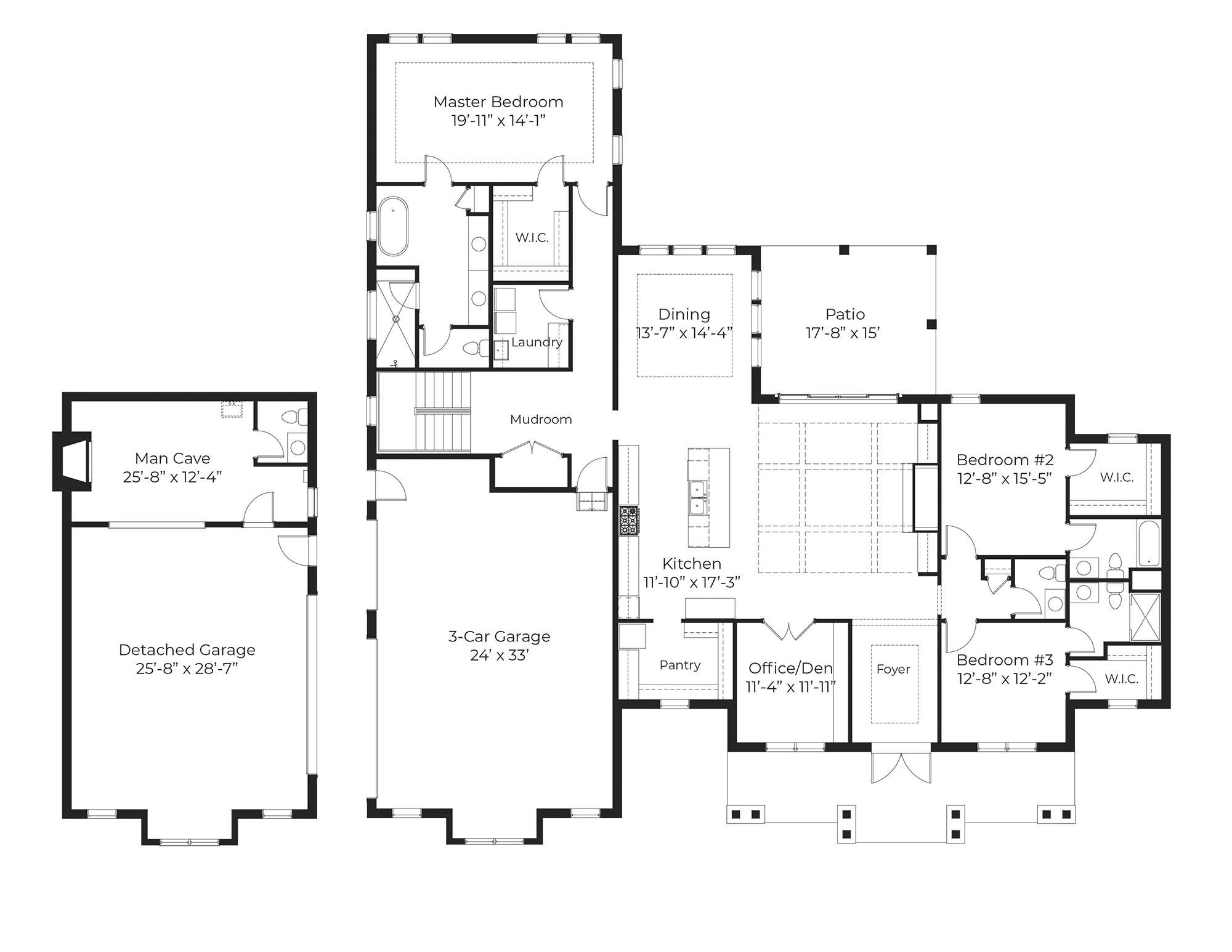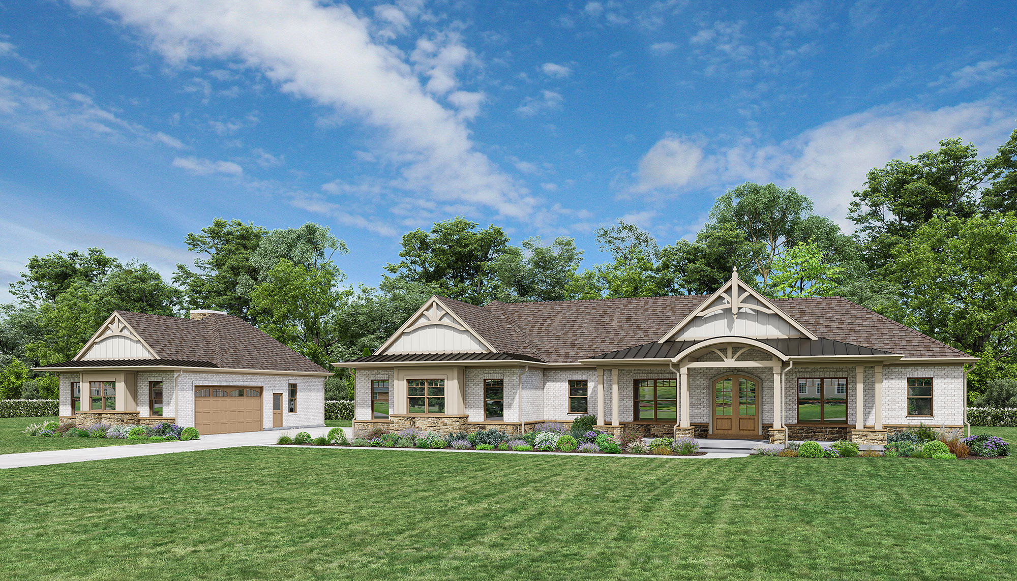The Annette is a charming home inspired by rural English houses. Features include a steel-pitched hip/gable, stone and brick exterior, and asymmetric design details. The Annette prioritizes cozy interiors with exposed beams, fireplaces, and cased windows.